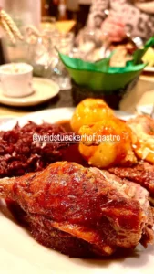 Die Gänse werden zerlegt auf individuell auf dem Tisch serviert. Die Beilagen könnt Ihr am Buffet holen. Von daher seid Ihr von der Uhrzeit her flexibel.